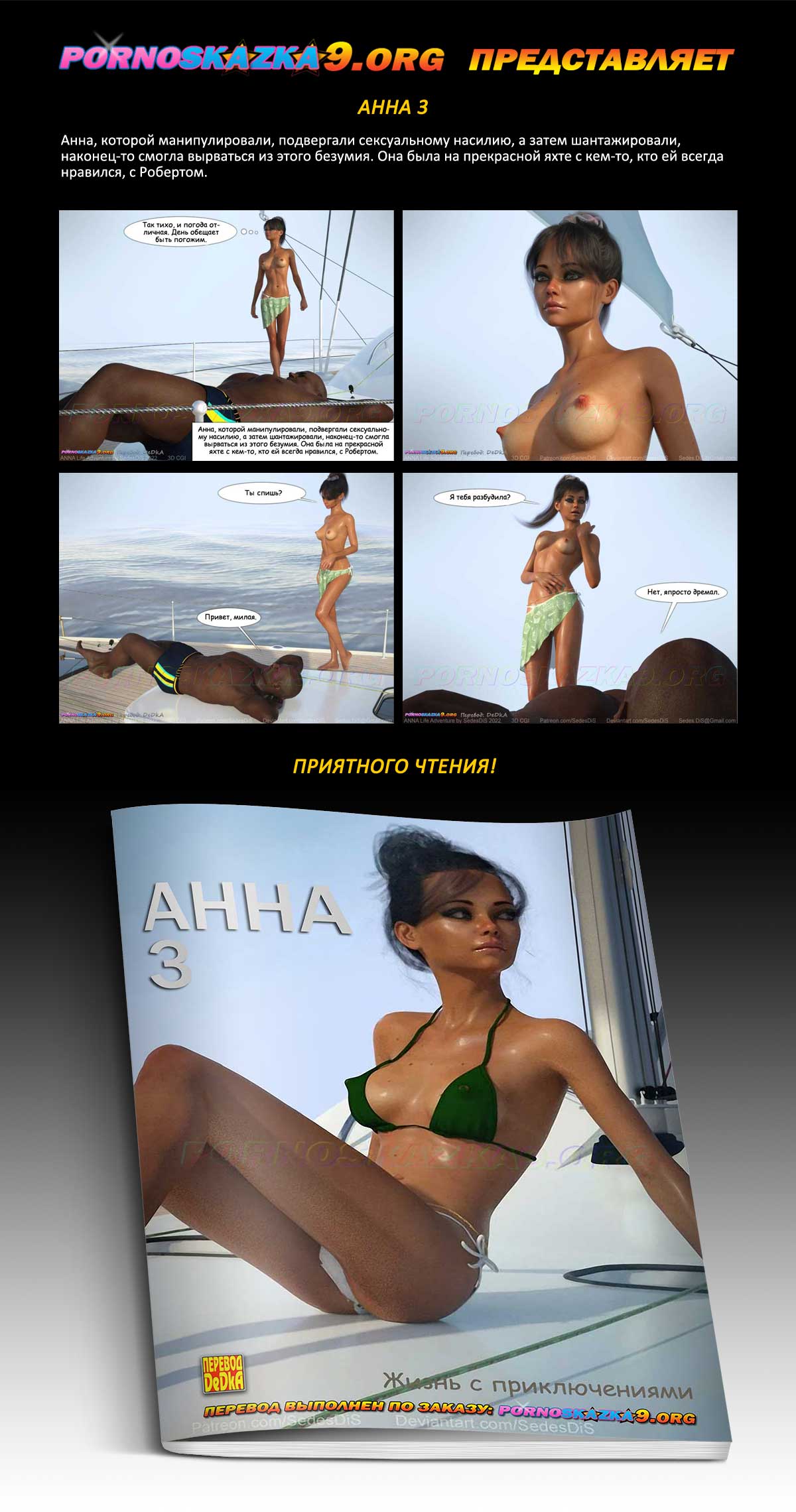 Порно комикс «Анна. Часть 3.» Анна, которой манипулировали, подвергали сексуальному насилию, а затем шантажировали, наконец-то смогла вырваться из этого безумия. Она была на прекрасной яхте с кем-то, кто ей всегда нравился, с Робертом.